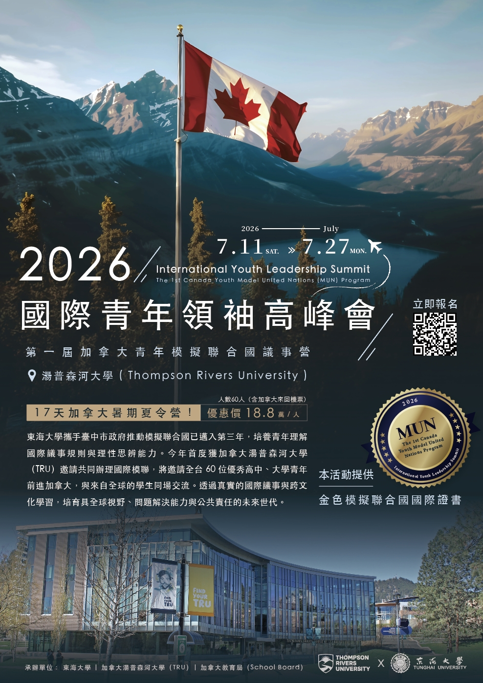 【2026國際青年領袖高峰會】 ——第一屆加拿大青年模擬聯合國議事營 —— 全台首創:鏈結加拿大官方教育局,建構國際名校申請優勢之培力計畫 透過 TRU 教授與國際議事專家指導,精進全英語立場文件撰寫與辯論技巧。 實地參訪國際事務單位,將理論與國際政治現實對接。 透過 17 天的北美校園生活,深度理解北美社會與永續發展(SDGs)之實踐。 領袖營由加拿大TRU大學與東海大學以跨國策略聯盟合作辦理。參與學員結業時,將獲得由 TRU 與東海大學頒發之「國際青年領袖學習證書」。此證書具備高度國際公信力與移動力認證,是學生未來申請海外名校(如多倫多大學、UBC、常春藤盟校)時,證明其具備跨文化領導力與國際參與能力的關鍵加分文件。 外語暨文化跨域學習:突破傳統台灣學生模擬聯合國辦理方式,本領袖營特別安排加拿大教育局暨國際認證師資授課。透過混合編組與工作坊,讓學生在真實的全英語環境中,創新學習進行文化觀點碰撞、遊說與談判,徹底提升語言應用能力。 國際學生交流實作會議:與來自世界五大洲國家的學生透過花園會議(Gardan Meeting)與國際學生之夜(Student Social Event)深入進行語言與文化的交流,本計畫之課程規劃對接北美大學入學審查標準,強調實際社會參與、領導力與批判性思考,為學生建立完整的個人品牌與競爭力。