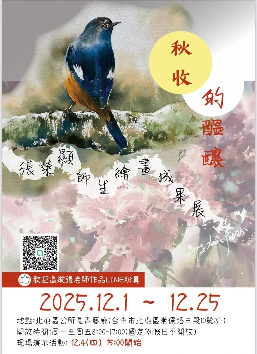 |地點|北屯區公所三樓藝廊|現場演示活動|12/04(四)下午3:00,藝術家將親自示範創作的每一筆、每一層色彩,近距離感受作品從心念萌芽、逐步成形的魅力,彷彿在眼前綻放出一幅幅屬於美的故事。無論您是熱愛藝術、渴望感受美感能量,或者在忙碌的日常中想為自己停下腳步——誠摯💌邀請您,與我們一同沉浸於典雅而動人的創作時光,一起共享這場細緻溫暖的藝術相遇🎨✨