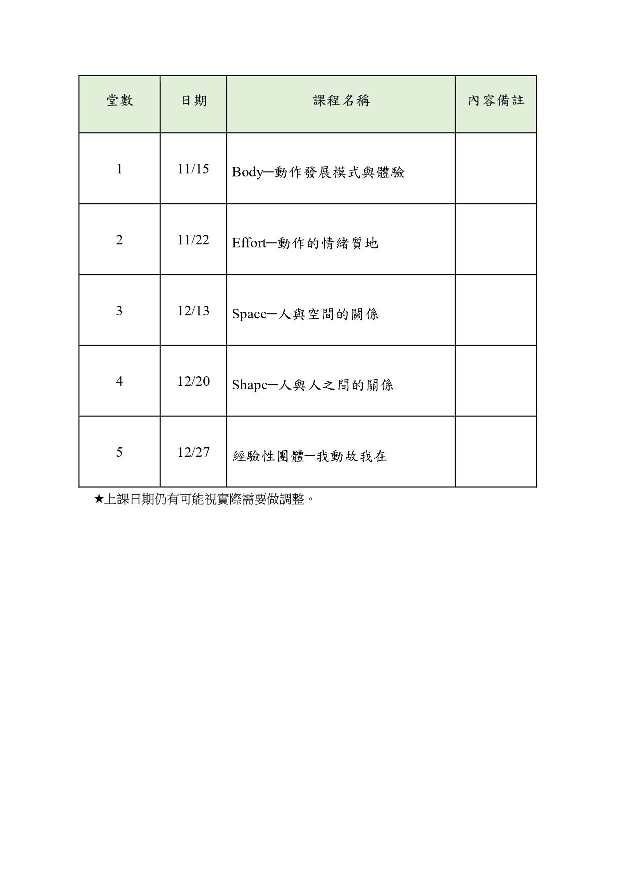 課程形式:為舞蹈動作治療工作坊形式,以身體動作為媒材探索內在相關主題與創作歷程,著重透過動作體驗式的學習,「並非」心理治療。