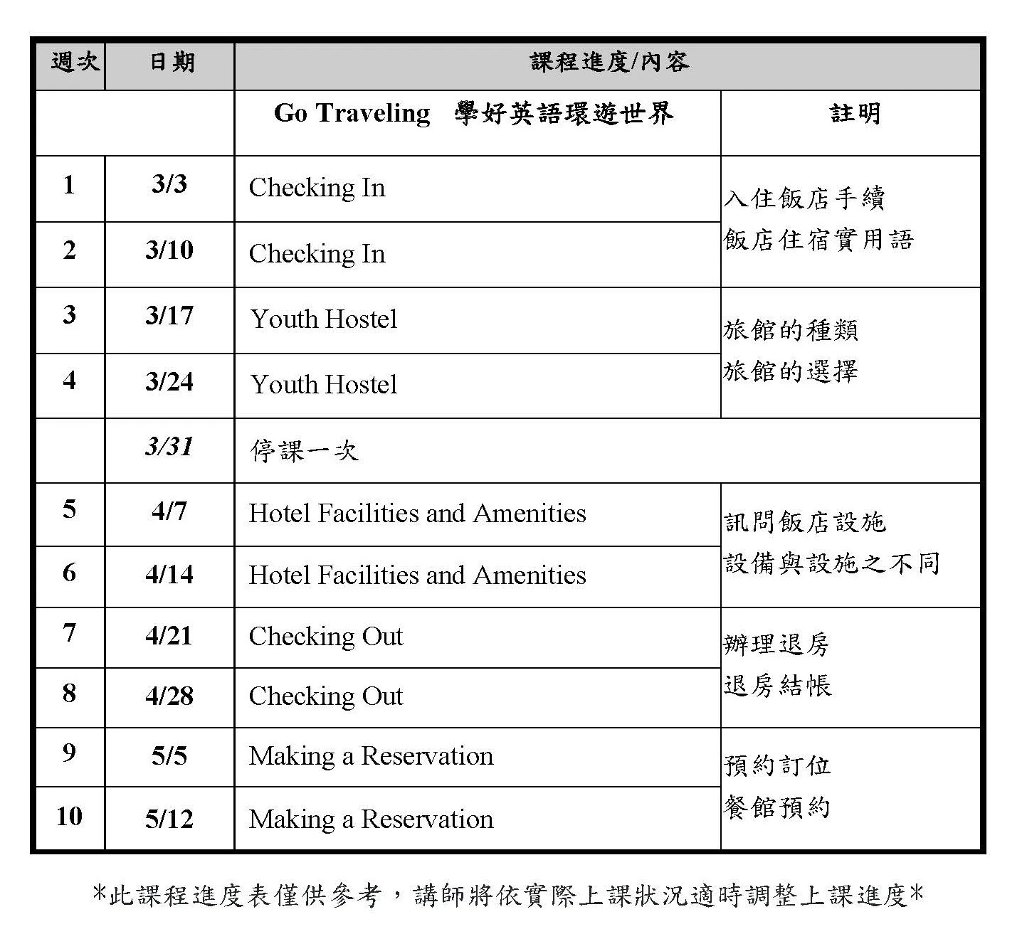 想要自助旅行,卻因為英文程度不夠好而裹足不前嗎? 本課程目標希望讓學員具備基本的觀光旅遊英語溝通能力。