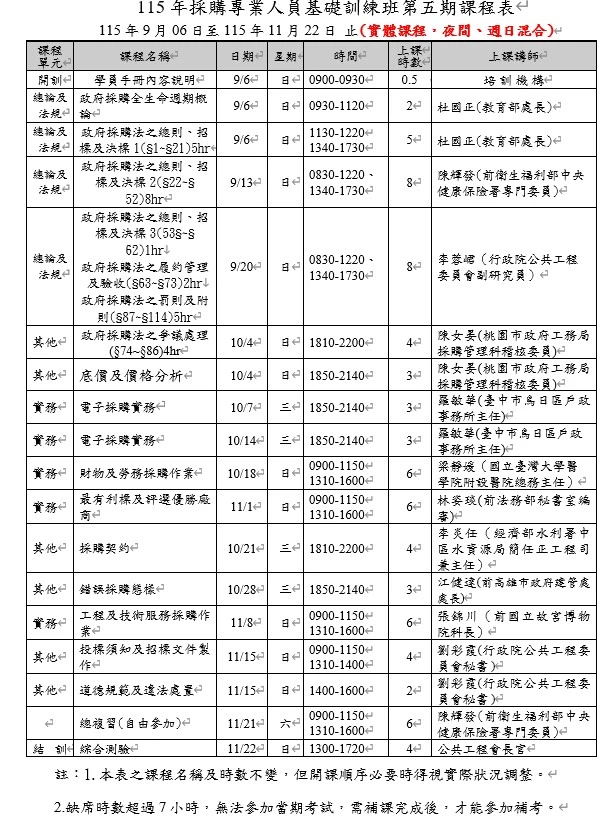 * 政府採購基礎班第五期(假日夜間混合班-實體上課+實體考試):115年9月06日至11月22日,每週三夜間及每週日白天,共70小時。
