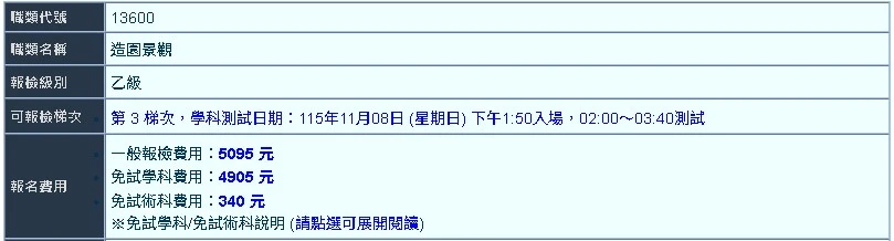 「造園景觀」職類乙級技術士技能檢定將於115年8月27日開始報名(第三梯次),預定11月8日考學科。