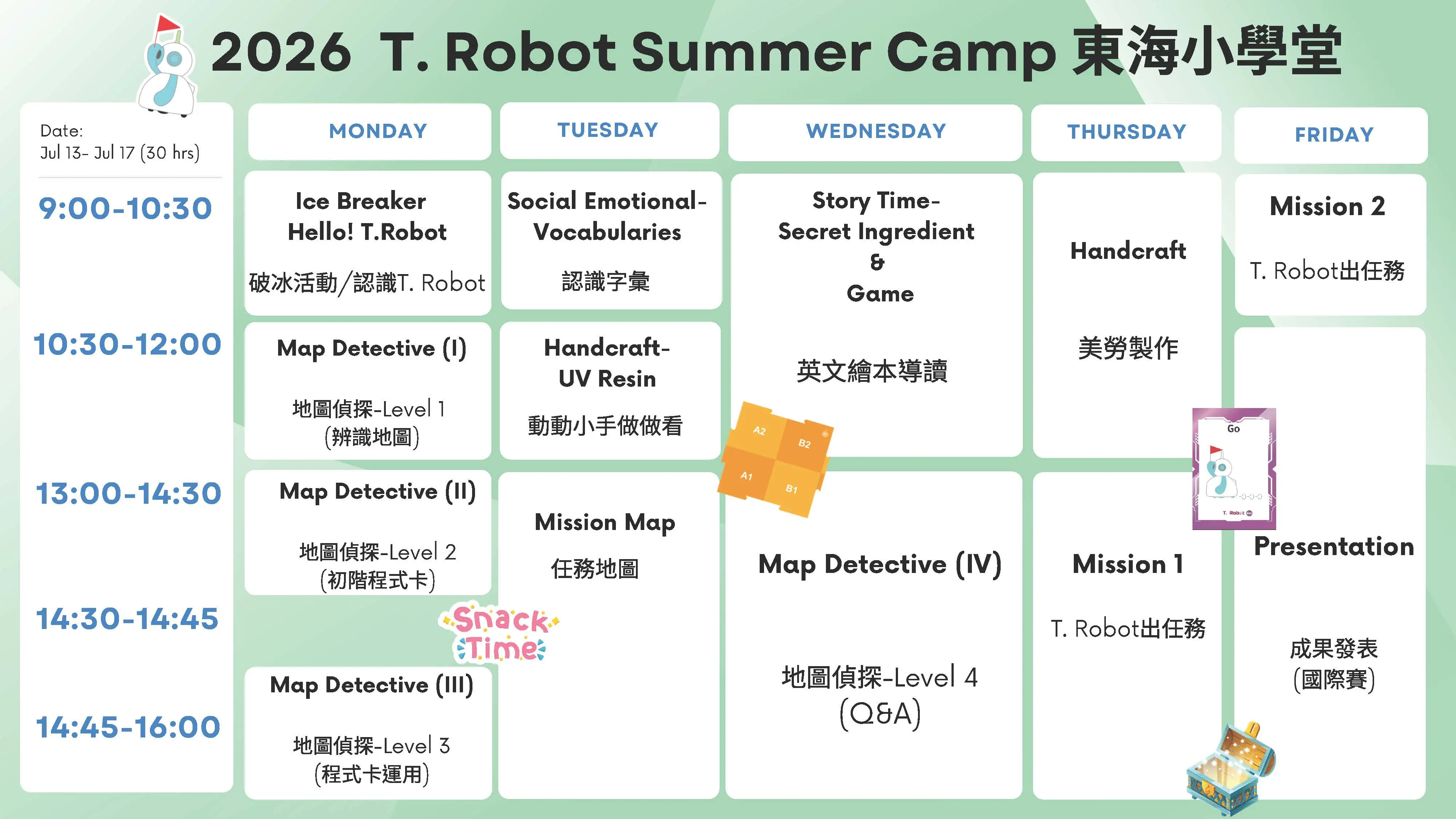 營隊結合英文繪本故事、T. Robot程式邏輯任務與藝術創作DIY,培養學生的閱讀理解與運算思維能力,同時啟發創造力與想像力。課程以活潑有趣的方式引導、透過互動學習與實作體驗,學生不僅能提升英語能力,還能建立自信,樂於探索與表達。