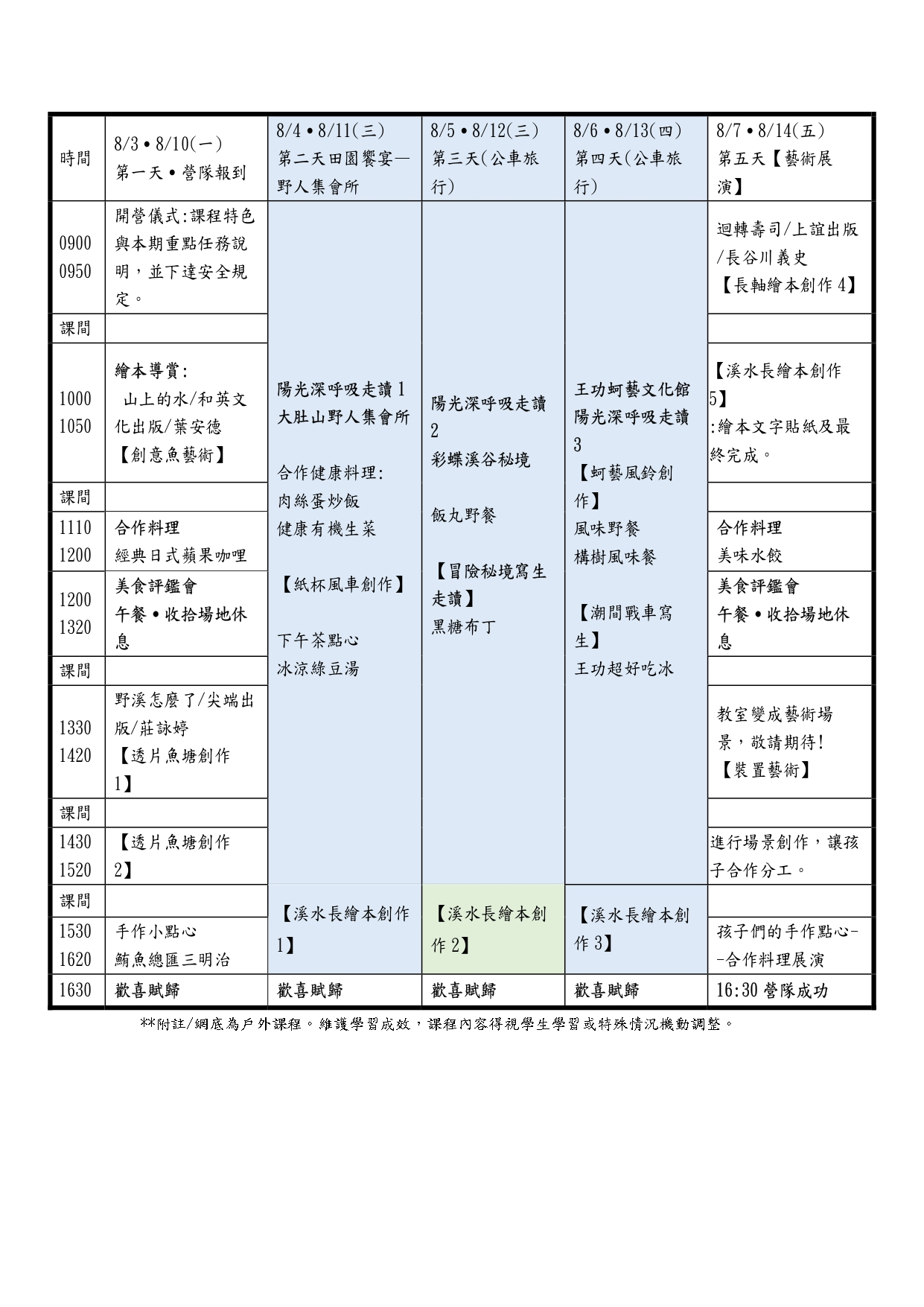 - 請攜帶個人餐具及市民悠遊卡,戶外活動請留意營隊手冊說明。